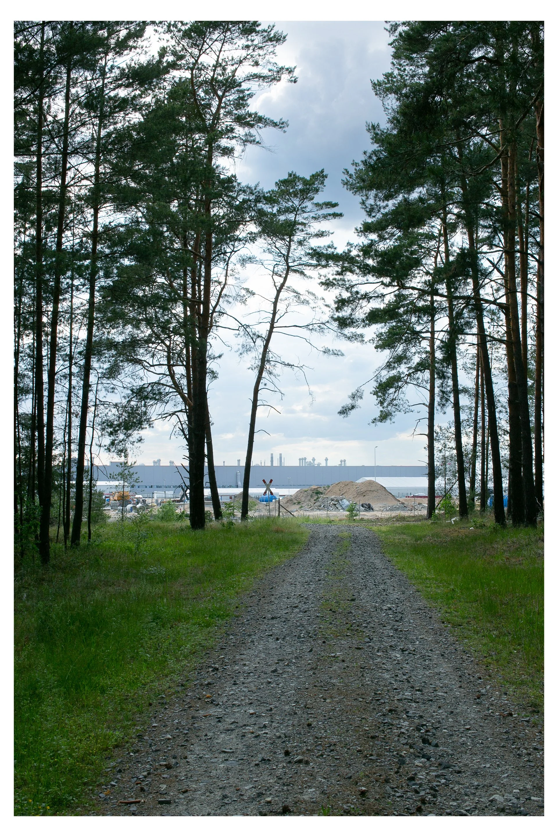A forest service road leads to the construction site of Tesla’s Gigafactory in Grünheide, Brandenburg.